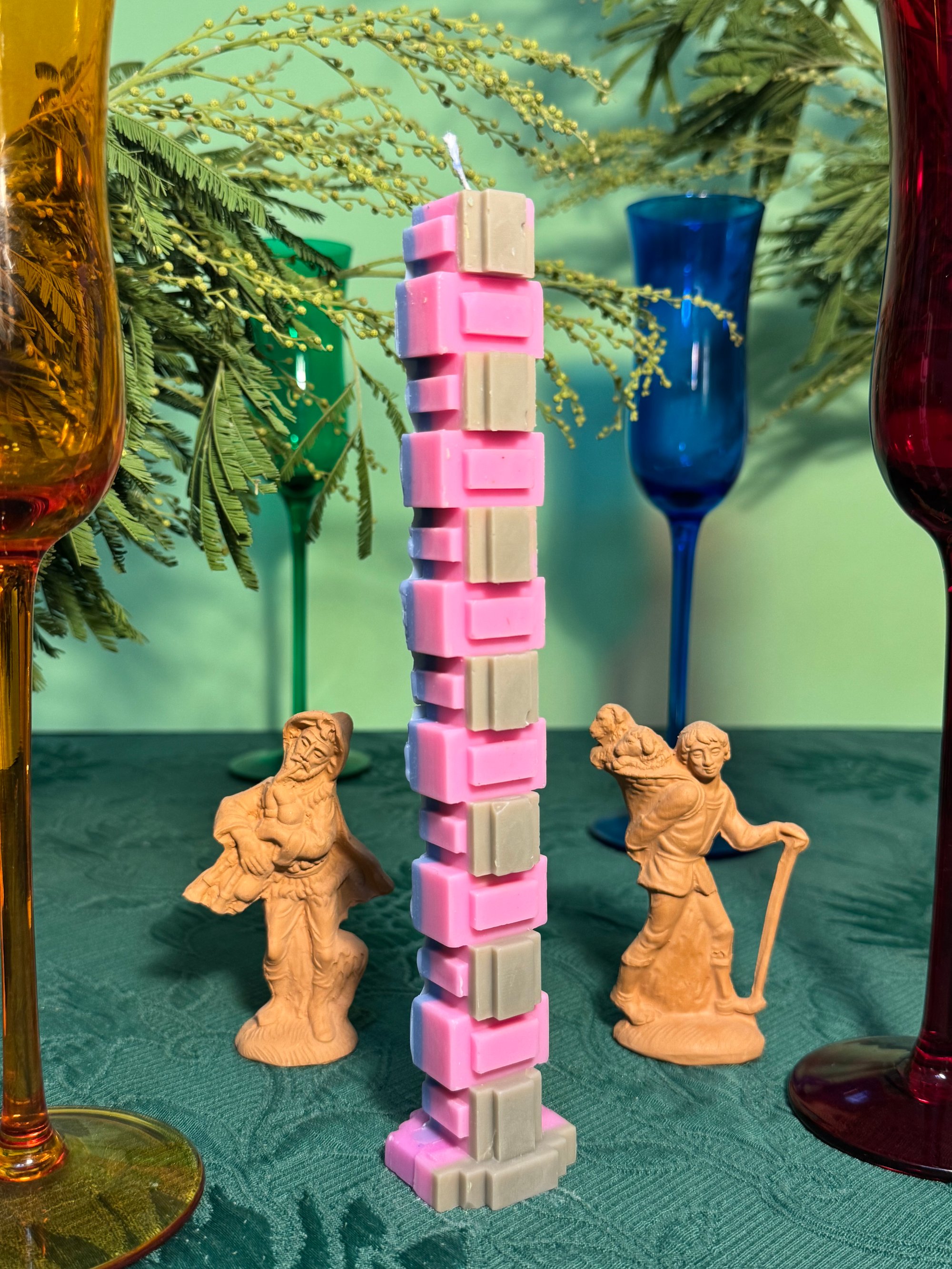 Hand poured Soy wax, moulds designed by myself and 3D printed, to get the weirdest most angular candle out there.