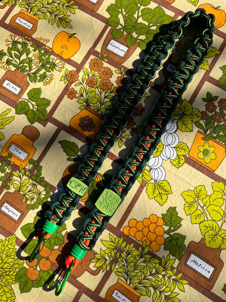 Aprox 1m of strong PPM rope, hand knotted by myself. 2 strong carabiners in blue or green depending on the day. + A 3d Printed KSFW logo bead